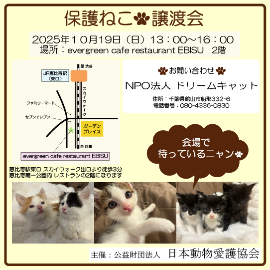 2025.09.25 活動報告 Web担当 10月19日 譲渡会のご案内 10月19日(日)、恵比寿にて日本動物愛護協会主催の譲渡会に参加いたします。 皆様にお会いできることを心よりお待ちしております! シェア! ポスト シェア はてブ 送る Pocket feedly
