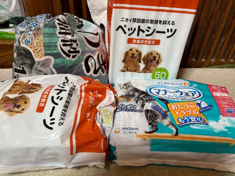 ペットシート、マナーウエア、猫砂、チュール、ドライフード、缶詰、ウエットフード