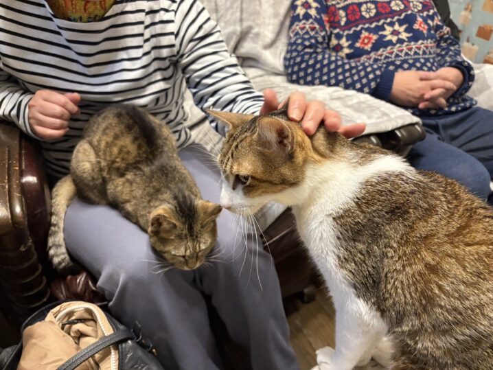 シェルターの猫達はいつもいらぅしゃる、ご夫婦のお膝の上に乗ったり、近くに近づいたりと大騒ぎです!