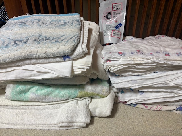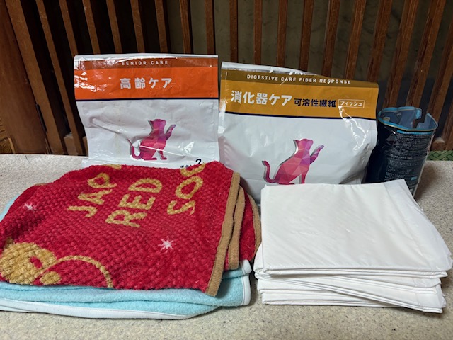 ペットシート、タオル類、新聞紙、猫用ミスト
