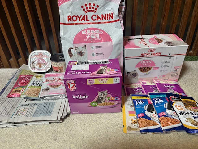 ドライフード、ウエットフード、缶詰、新聞紙、ティッシュペーパー