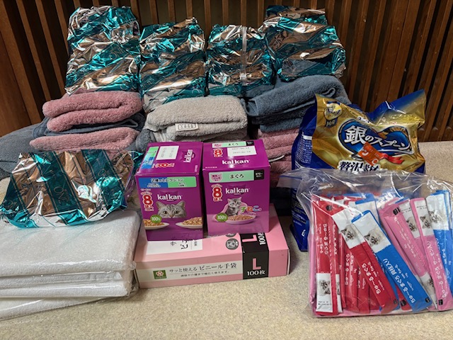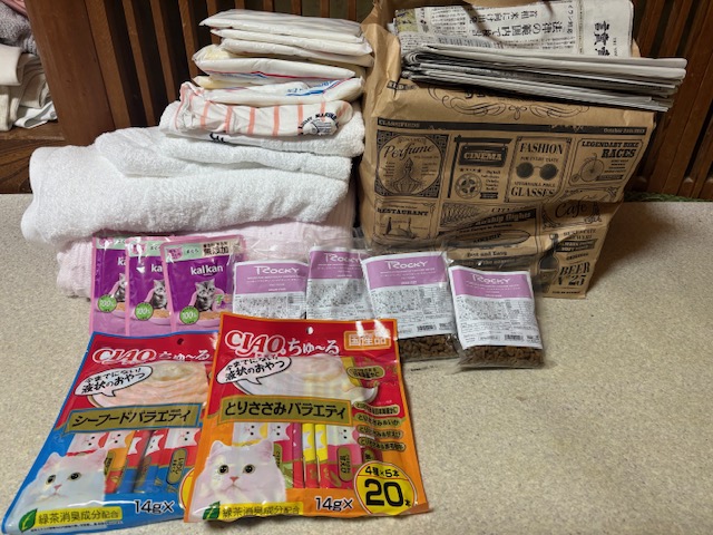 3月31日 海辺の猫集会様:                                      タオル、新聞紙、ドライフード、ウエットフード、チュール、猫用トイレ